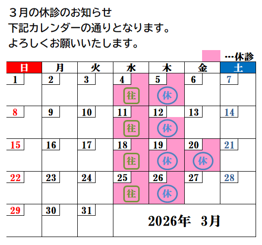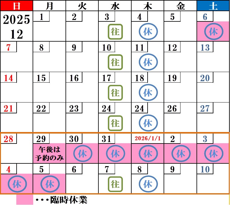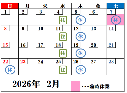 | 9:00~12:00 | ○ | ○ | ◎ | ✕ | ○ | ○ | ○ | ✕ |